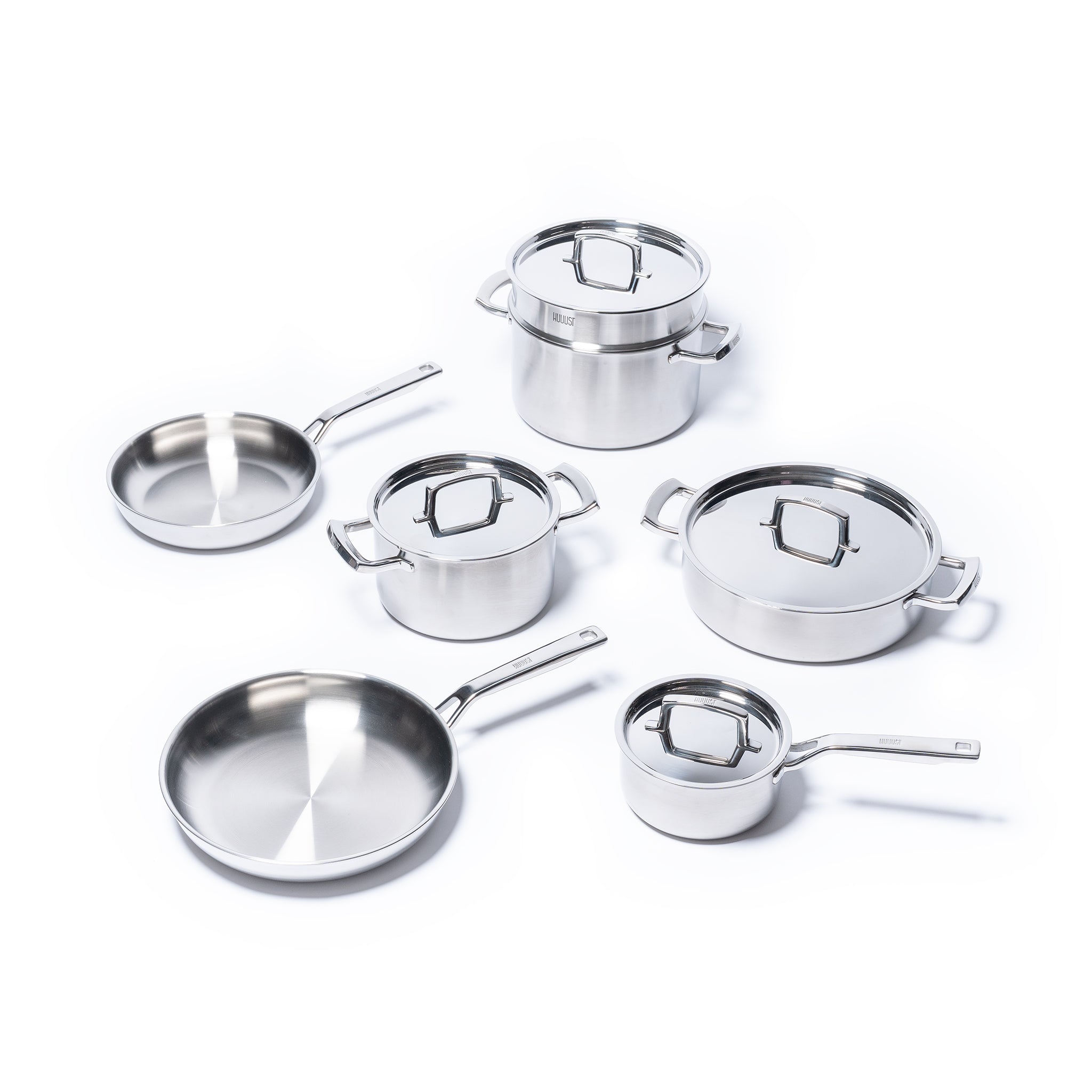 Sedmikusová sada z vícevrstvé nerezi. Pánve, hrnce, rendlík i napařovač. Rovnoměrné zahřívání, přesné vaření a snadná údržba pro každý den.